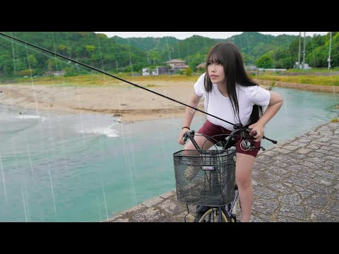 Video 雨に濡れながら魚を釣って食べる女。